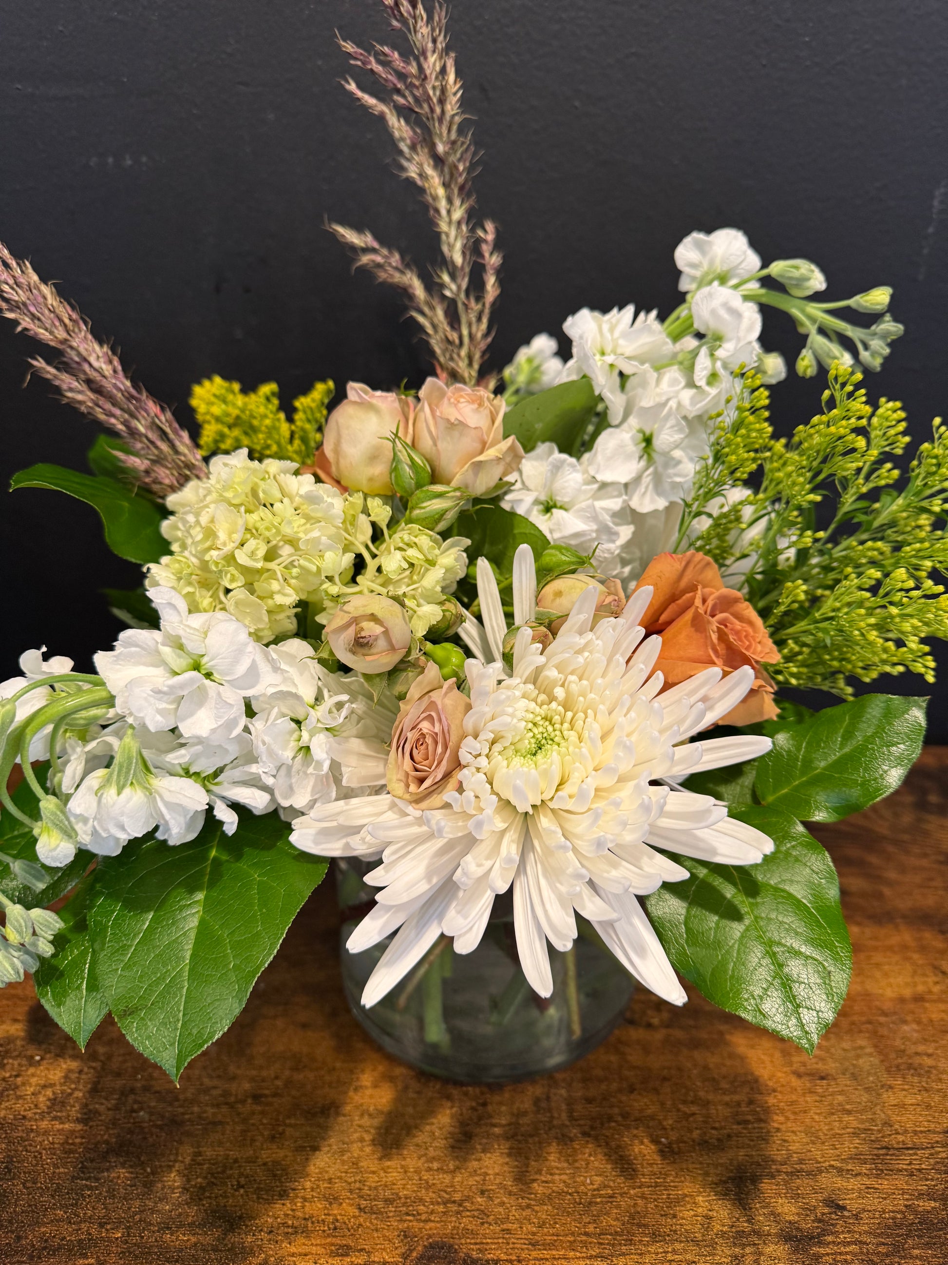 This petite sympathy bouquet is the perfect size for a gentle “thinking of you” gesture when words fall short. Soft earth-tone roses mingle with delicate mums and airy mini hydrangeas in soothing, muted shades, creating a tender arrangement that quietly conveys love, comfort, and heartfelt peace.